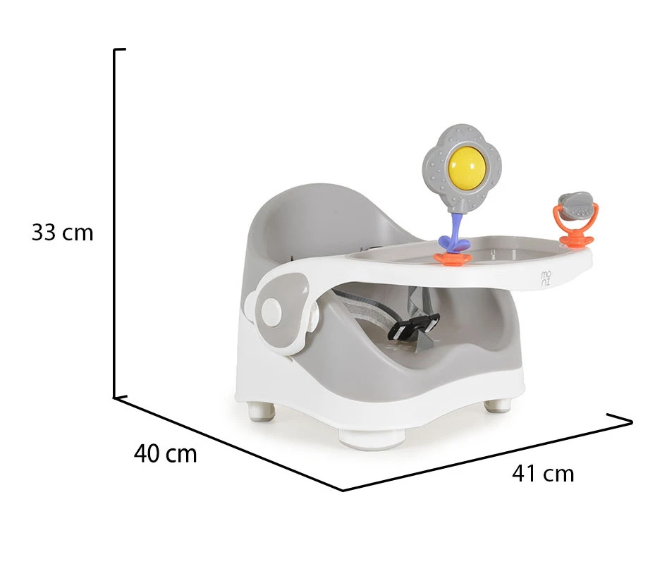 De Pistachio heeft een dubbel en verstelbaar eetblad (3 posities) dat makkelijk schoon te maken is, handig! Daarnaast zitten er twee vrolijke speeltjes aan het blad, waardoor je kindje zich voor of na het eten niet zal vervelen in het stoeltje. De 3-punts gordel zorgt ervoor dat je kindje altijd veilig zit in de verhoger. Eet smakelijk!