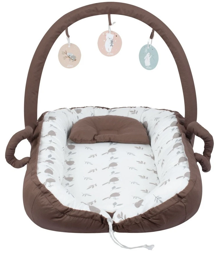 Het nestje heeft een ergonomische vorm en een extra hoofdkussentje. Je kleine zal zich niet snel vervelen, hij is namelijk voorzien van een speelboog met drie schattige kaartjes. Uiteraard is het ook mogelijk om andere speelgoedjes (niet inbegrepen) te bevestigen aan de speelboog. Tevens heeft hij een ruim muskietennet, dat je kindje beschermt tegen insecten. De hoes is gemaakt van 100% katoen en is afneembaar zodat je hem kunt wassen.